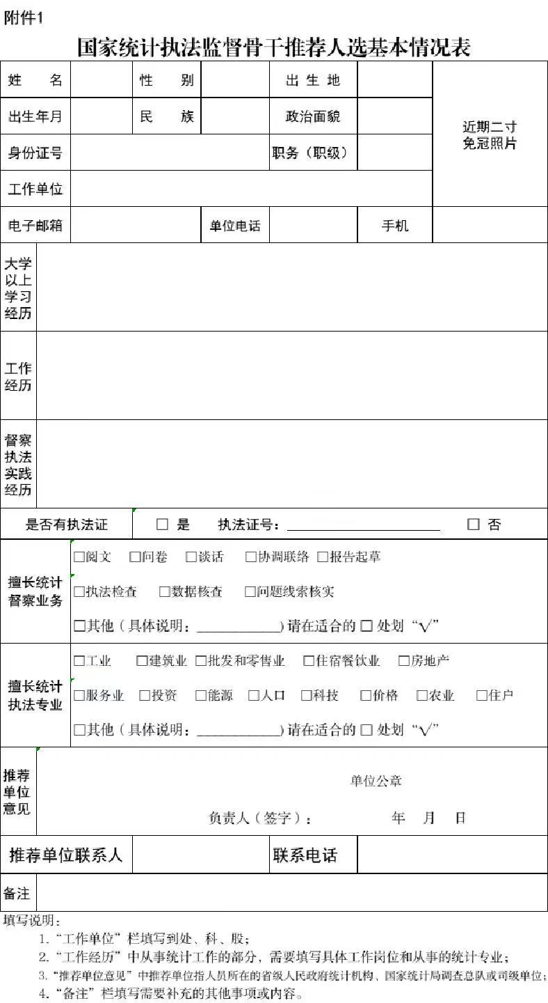 附件:1.国家统计局执法监督骨干推荐人选基本情况表