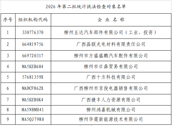 依据《中华人民共和国统计法》等相关法律规定,柳州市统计局依法对以下10家单位开展执法检查。现将执法检查对象名单(见附件)进行公示,具体检查时间及相关要求另行通知。